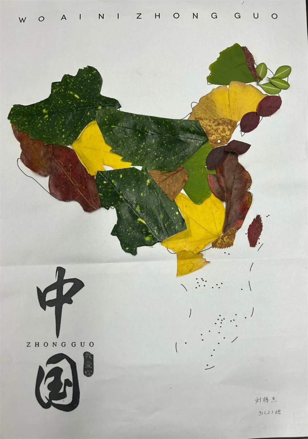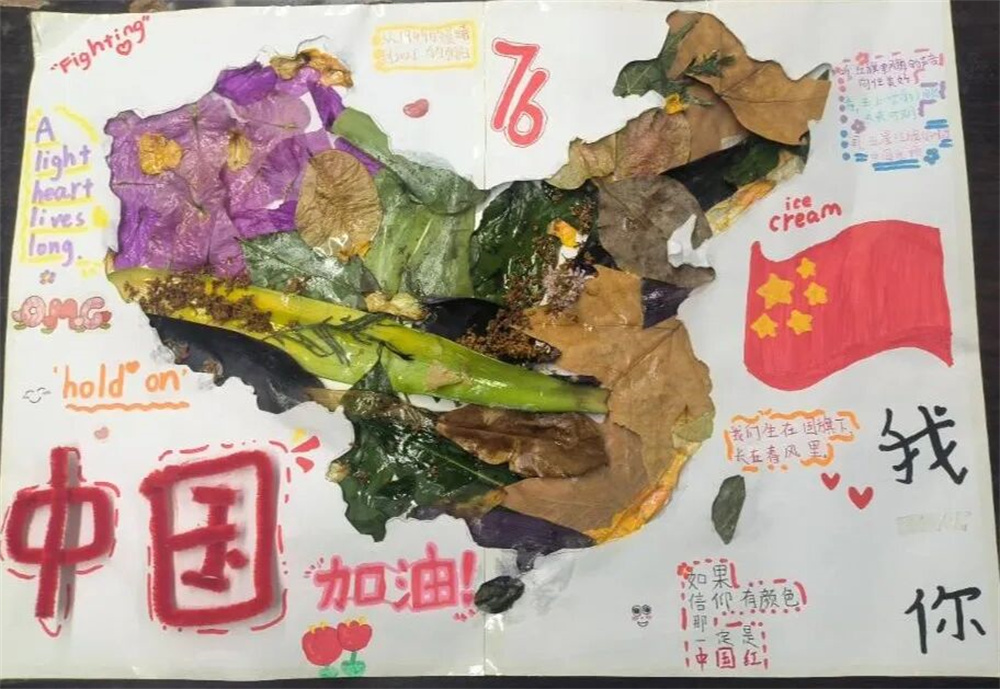五、六年级的同学们则化身“自然艺术家”,拾起秋日的落叶,开启了“落叶筑华夏”的创意征程。