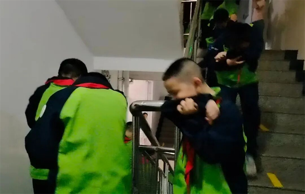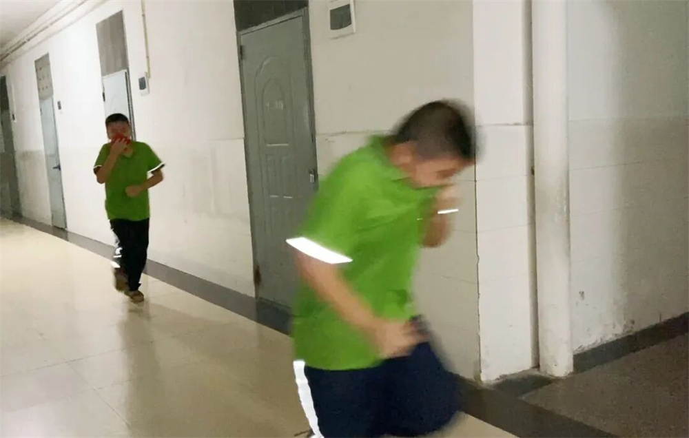 演练过程中,宿管老师迅速指导学生捂住口鼻,弯腰低姿,引导学生按照预定疏散路线快速有序向宿舍楼前集合地转移。
